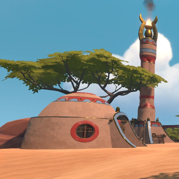 Their village structures consist primarily of rounded adobe structures with red and blue markings. Their architecture and clothing resembles a cross between native American and Arabic designs.